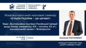1 жовтня 2025 р. о 15-00 відбудеться доповідь кандидата історичних наук, доцента кафедри історії СумДУ Анатолія Гончаренка на тему «Експансійна політика Російської імперії щодо Китаю