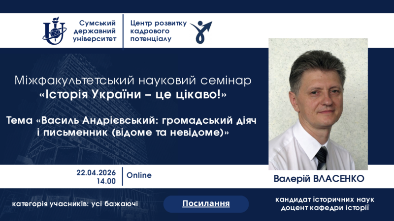 13 квітня 2026 р. в бібліотеці Сумського державного університету відбулася презентація книжкових видань, присвячених історії дипломатії України. Захід провів кандидат історичних наук, доцент кафедри історії СумДУ Валерій Миколайович Власенко, який представив праці, що висвітлюють малодосліджені аспекти становлення дипломатичної служби України та роль у ній жінок – «Жінка в офіційній і публічній дипломатії. Нариси, есеї, інтерв’ю», «Жіноче обличчя української дипломатії: нариси, спогади, інтерв’ю» та навчальний посібник «Публічна дипломатія».
