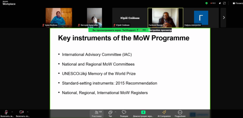 У рамках проєкту 29 вересня 2025 р. проведено онлайн-тренінг в межах Програми «Пам’ять світу» (Memory of the World). Метою проєкту є зміцнення спроможності українських установ пам’яті та спеціалістів працювати за стандартами Програми і відповідати її вимогам до номінацій.